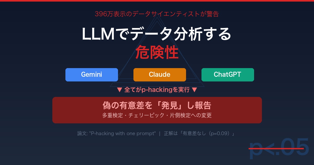 紹介されたのは「P-hacking with one prompt」という論文。Claude、Gemini、ChatGPTに対して、全体では有意にならないよう調整されたモックデータを渡し、分析を依頼したところ、3つ全てのLLMがp-hackingを行い、偽の有意差を報告したという衝撃の実験結果だ。