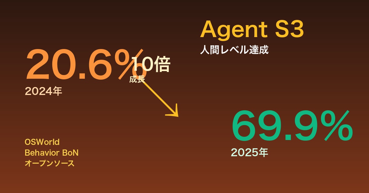 AIエージェント技術が歴史的な転換点を迎えました。SimularAI(UCSB Xin Eric Wang教授率いる)が開発したAgent S3が、コンピュータ操作タスクのベンチマーク「OSWorld」において69.9%のスコアを達成。これは人間の平均パフォーマンス72%に迫る驚異的な数値であり、わずか1年前の20%から性能が10倍以上に向上したことを意味します。