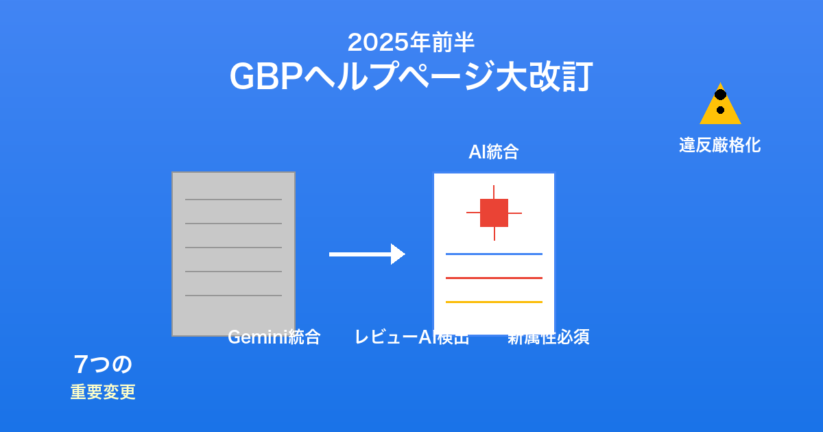2025年前半、Googleビジネスプロフィール(GBP)のヘルプページが大幅に改訂されました。この改訂は、AI機能の統合、新しいガイドライン、そして違反に対するより厳格な措置を含む、ローカルビジネスにとって極めて重要な変更を含んでいます。本記事では、すべてのビジネスオーナーが知っておくべき7つの重要な変更点と、具体的な対応策を詳しく解説します。