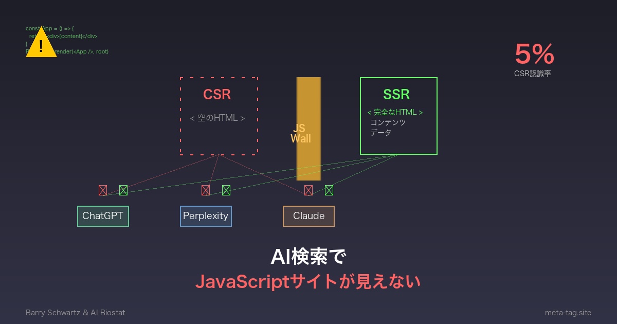Web開発者とSEO担当者に衝撃が走っています。主要なAI検索エンジンがJavaScriptでレンダリングされたコンテンツを正しく認識できないという深刻な問題が発覚したのです。Barry Schwartz氏とAI Biostat氏が報告したこの問題は、クライアントサイドレンダリング(CSR)を採用している数百万のウェブサイトが、ChatGPT、Perplexity、Claudeなどの AI検索から事実上「見えない」状態になっている可能性を示唆しています。