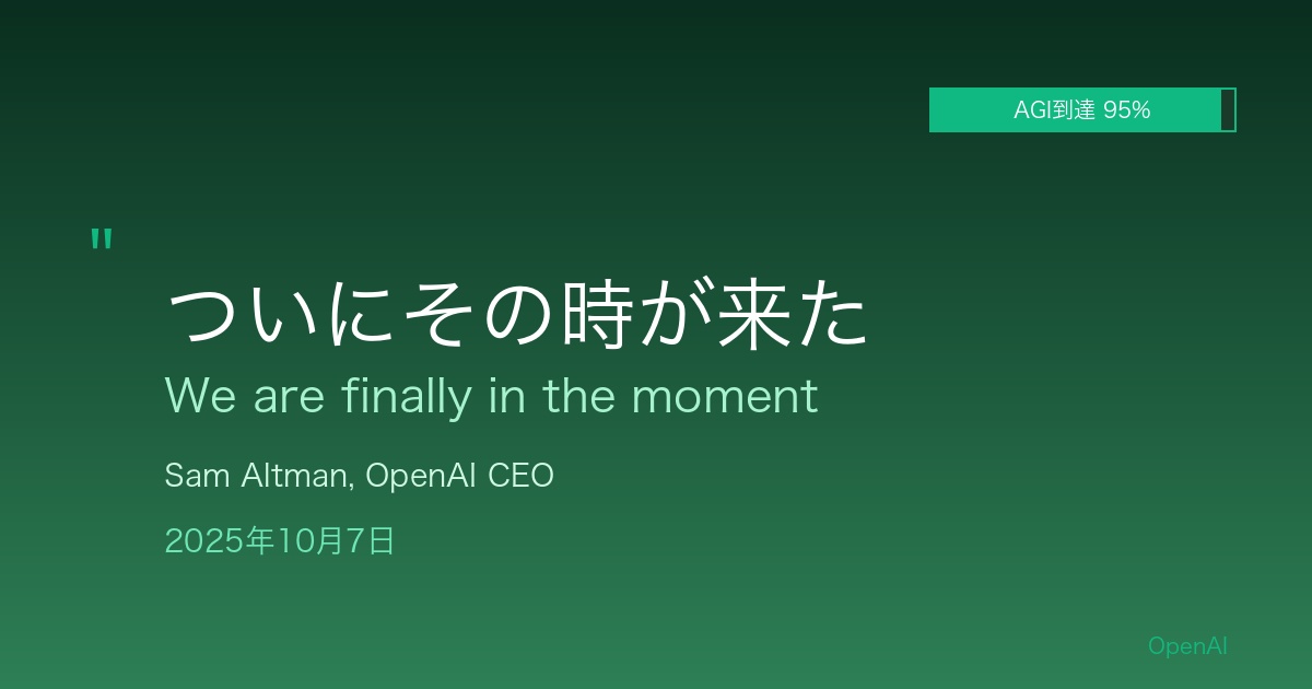 2025年10月7日、OpenAI CEOのSam Altman(サム・アルトマン)氏が、 AGI(Artificial General Intelligence:汎用人工知能)到達に関する歴史的発言を行いました。インタビューの中で、Altman氏は「ついにその時が来た(we are finally in the moment)」と述べ、AIが人類の知識基盤を拡大する新たな発見を成し遂げ始めていることを明言しました。