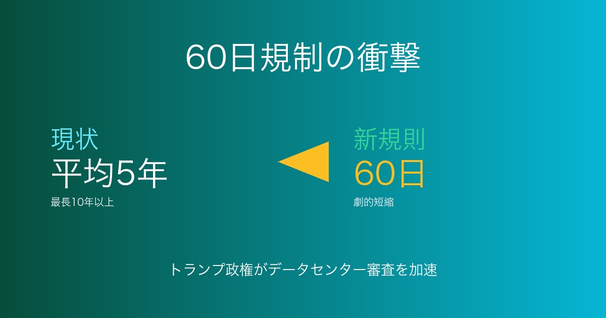 トランプ政権によるデータセンター電力網接続の60日規制は、 AI産業の「止められない」加速を象徴する政策です。