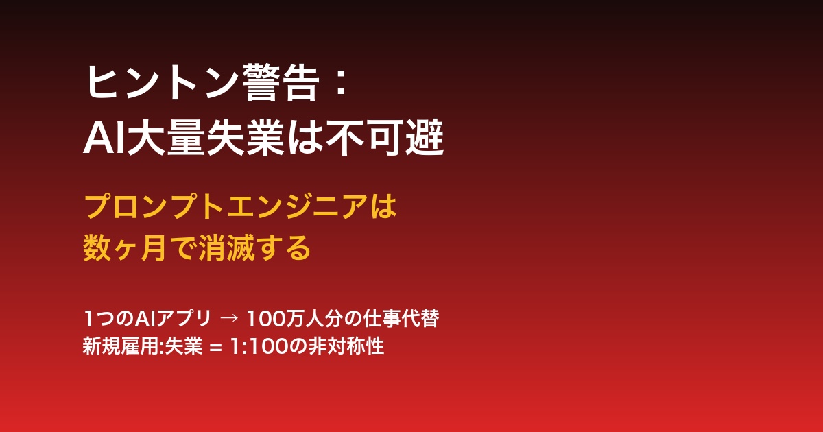 「AIの父」ジェフリー・ヒントン氏が、AI失業に関する経済学者の楽観論を真っ向から否定しました。「プロンプトエンジニアのような仕事は、AIが自分自身でプロンプトを書けるようになるまでの数ヶ月間しか必要ない」——この発言は、AI時代の労働市場に対する一般的な認識を根底から覆すものです。