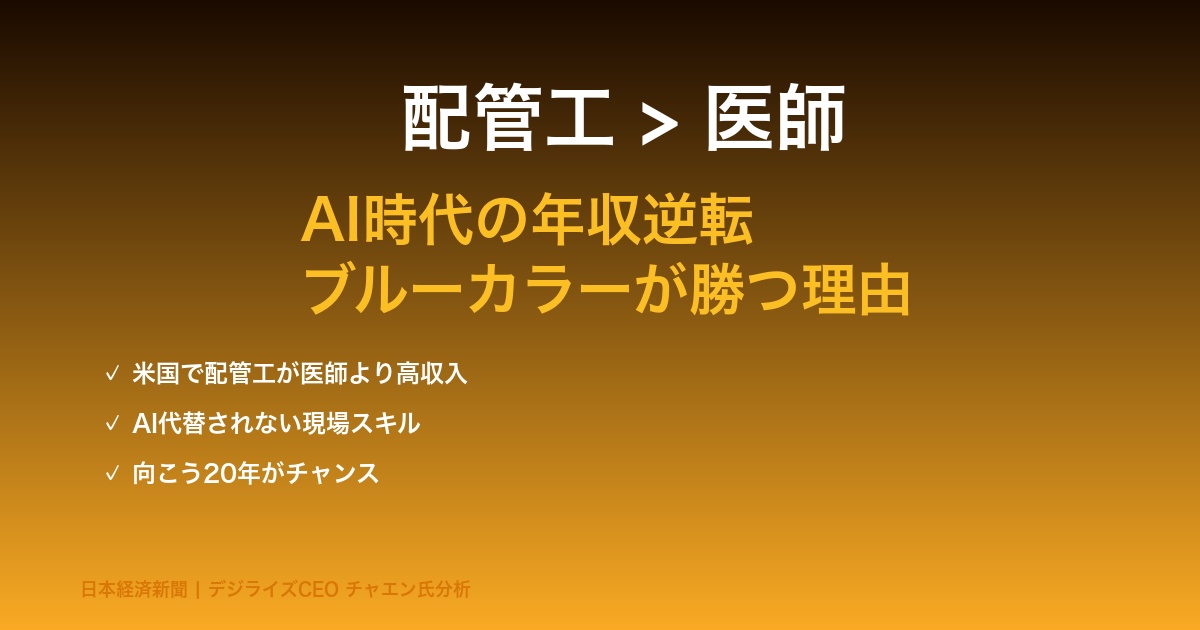 AI時代の到来により、労働市場で前代未聞の逆転現象が起きています。米国では配管工やエアコン修理技師といったブルーカラー職種が、医師や弁護士といった伝統的な高収入職業を年収で凌駕するケースが続出しています。