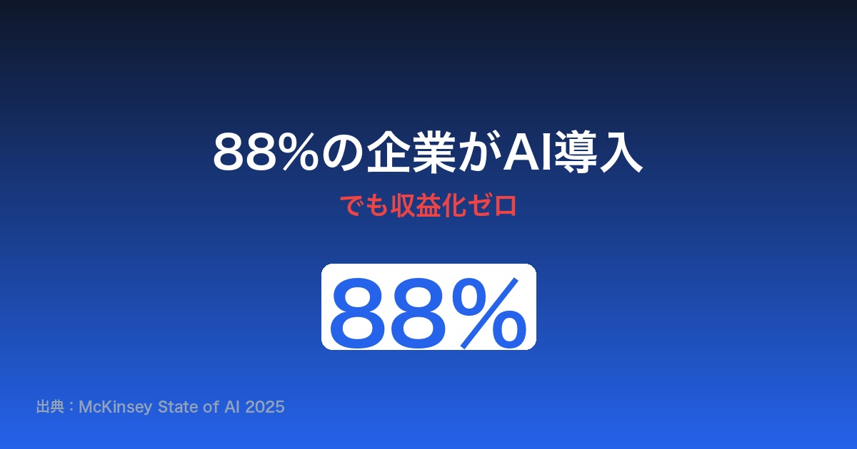 McKinseyの「The State of AI in 2025」レポートが示した現実は厳しい。88%の企業がAIを導入しているが、実質的な収益化を達成しているのはわずか15-20%。大半の企業は「パイロット地獄」に陥り、AI投資から何のリターンも得られていない。
