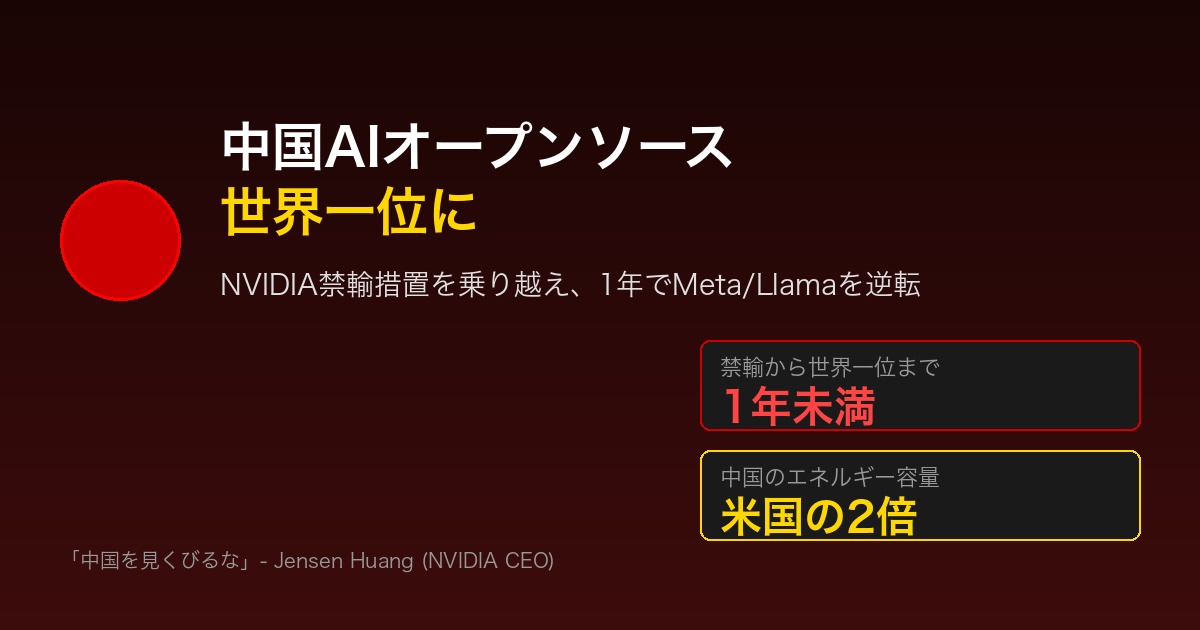 【衝撃】中国がMetaを追い抜きオープンソースAI世界王者に―禁輸措置を突破、Jensen Huangが警告「中国を侮るな」