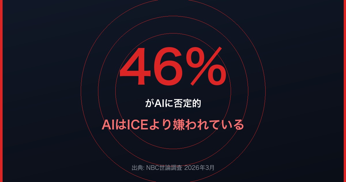 2026年3月、NBCが実施した全米世論調査の結果が大きな反響を呼んでいる。登録有権者を対象とした調査で、46%がAIに対して否定的な感情を持っていることが明らかになったのだ。肯定的な評価はわずか26%、中立が27%という結果だった。