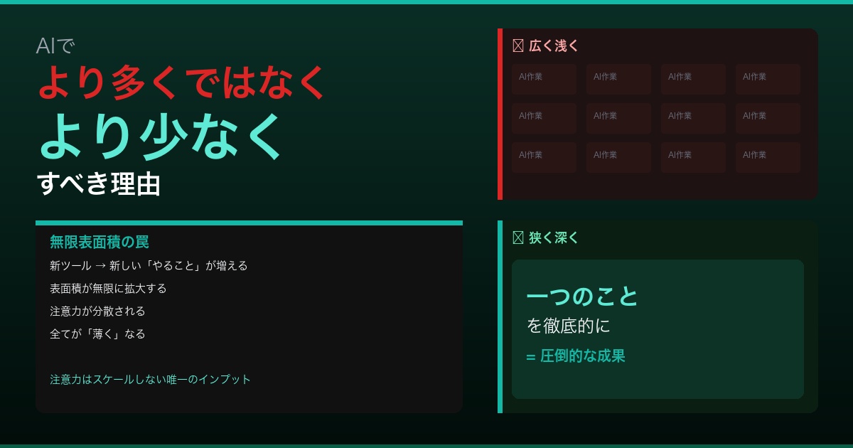 AIはアウトプットの量を爆発的に増やせる。しかし、そのアウトプットに込められる注意力・ケア・没入感は有限だ。12のAIワークフローを7つのプラットフォームで管理している人間は、一つのことに深く没入している人間には勝てない。
