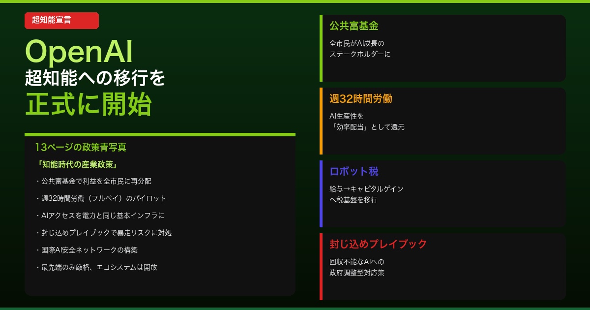 同時に公開されたのが、「知能時代の産業政策(Industrial Policy for the Intelligence Age)」と題された13ページの政策青写真だ。公共富基金、週32時間労働、ロボット税、AIの権利、封じ込めプレイブック──その内容は、超知能を遠いシナリオではなく「ニューディールレベルの野心を必要とする積極的な移行」として位置づけている。