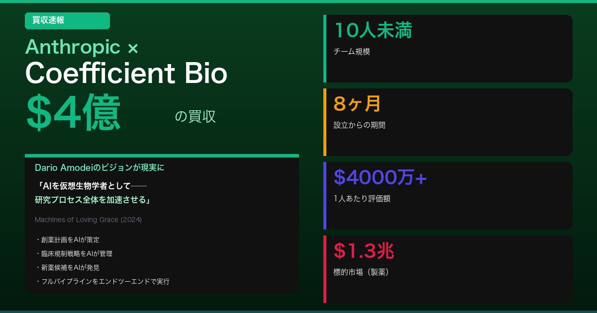 Anthropicが、ステルスモードのバイオテックAIスタートアップCoefficient Bioを約4億ドル(全額株式取引)で買収した。設立からわずか8ヶ月、従業員10人未満、公開製品なし──1人あたり4,000万ドル以上という破格の評価だ。