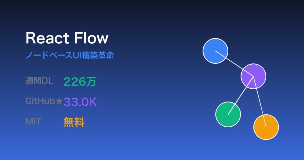 React Flowとは何か?ノードベースUI構築の決定版 React Flowは、ノードベースのUIエディタやインタラクティブな図表を構築するためのカスタマイズ可能なReactコンポーネントです。週間ダウンロード数226万、GitHubスター33.0Kという圧倒的な実績を持ち、S...