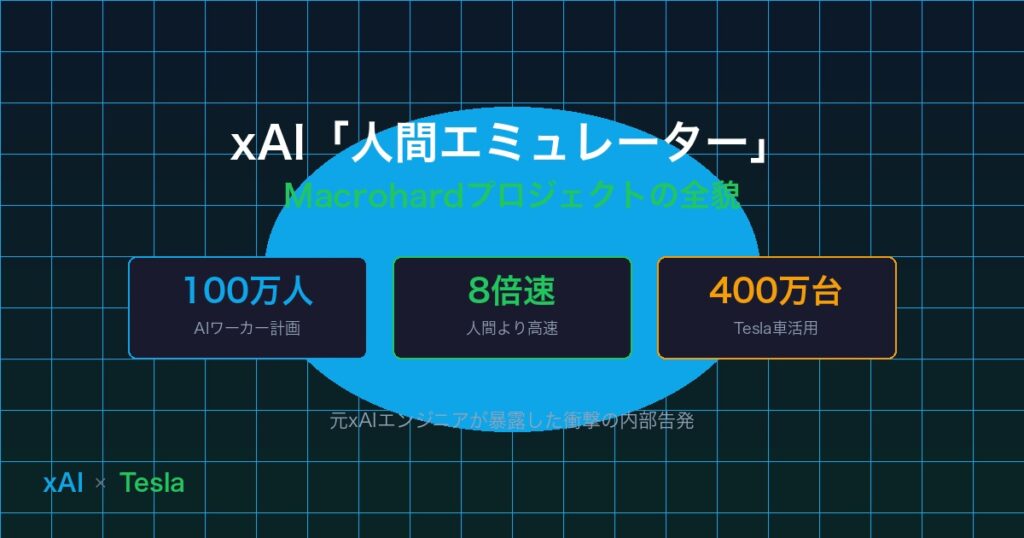 xAIの元エンジニアが暴露した「Macrohard」プロジェクト。人間のように振る舞うAI従業員、100万人規模のスケーリング計画、Tesla車のアイドル時間活用など、衝撃の内容を徹底分析。