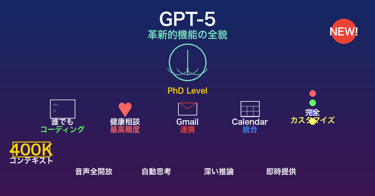 OpenAIがついにGPT-5を正式発表しました。「PhDレベルの専門家」と評される驚異的な知能を持つこの新モデルは、コーディング未経験者でもソフトウェア開発を可能にし、健康相談から業務効率化まで、人類の能力を根本的に拡張します。本記事では、GPT-5の革新的機能と、私たちの日常やビジネスに与える影響を詳しく解説します。