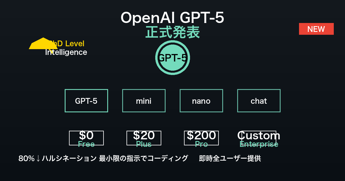 2025年8月7日、OpenAIは待望のGPT-5を正式発表しました。GitHubで一時的に公開されたブログ記事とその後の公式発表により、GPT-5は「gpt-5」「gpt-5-mini」「gpt-5-nano」「gpt-5-chat」の4つのバリエーションで展開され、「PhDレベルの知能」と評される驚異的な性能を実現しています。本記事では、GPT-5の革新的な機能、料金体系、そしてOpenAIの新たな経営戦略について詳しく解説します。
