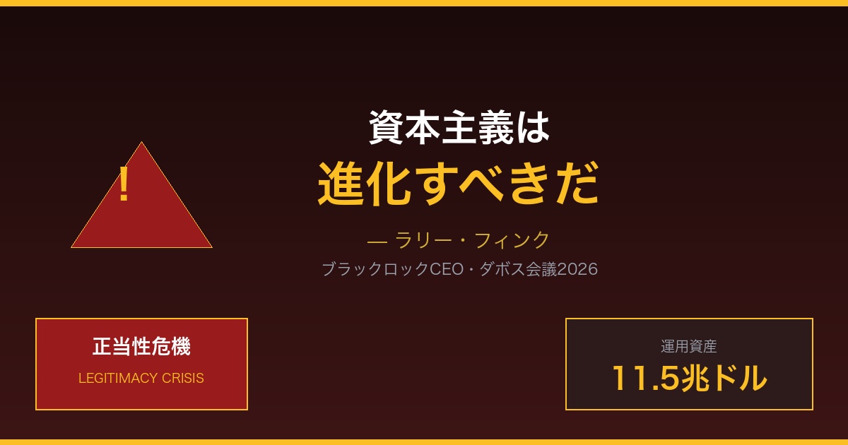 2026年1月19日、世界経済フォーラム(ダボス会議)で、世界最大の資産運用会社ブラックロックのCEOラリー・フィンクが衝撃的な発言を行った。「資本主義は進化すべきだ」——運用資産11.5兆ドル(約1,700兆円)を誇る金融界の頂点に立つ人物からの警告は、資本主義システムそのものへの正当性危機を象徴している。