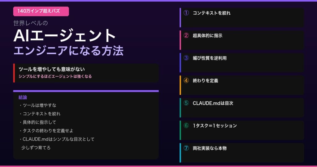 海外140万インプ超え──「シンプルが最強」の衝撃 海外のAIエンジニアコミュニティで140万インプレッションを超えるバズを記録した記事がある。タイトルは「How To Be A World-Class Agentic Engineer(世界レベルのAIエージェントエンジニアになる方法)」... -