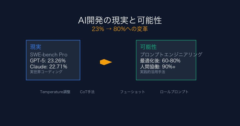 SWE-bench Pro最新結果(GPT-5: 23.26%)を踏まえ、AI開発の現実的限界と可能性を解説。Google公式プロンプトエンジニアリング手法を活用して、実世界コーディングでAI性能を最大化する実践ガイド。 -