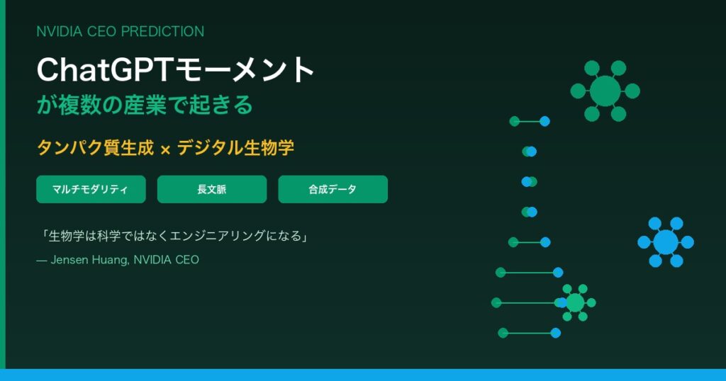 【衝撃予言】Jensen Huang「複数の産業がChatGPTモーメントの瀬戸際にある」|タンパク質生成が次の革命