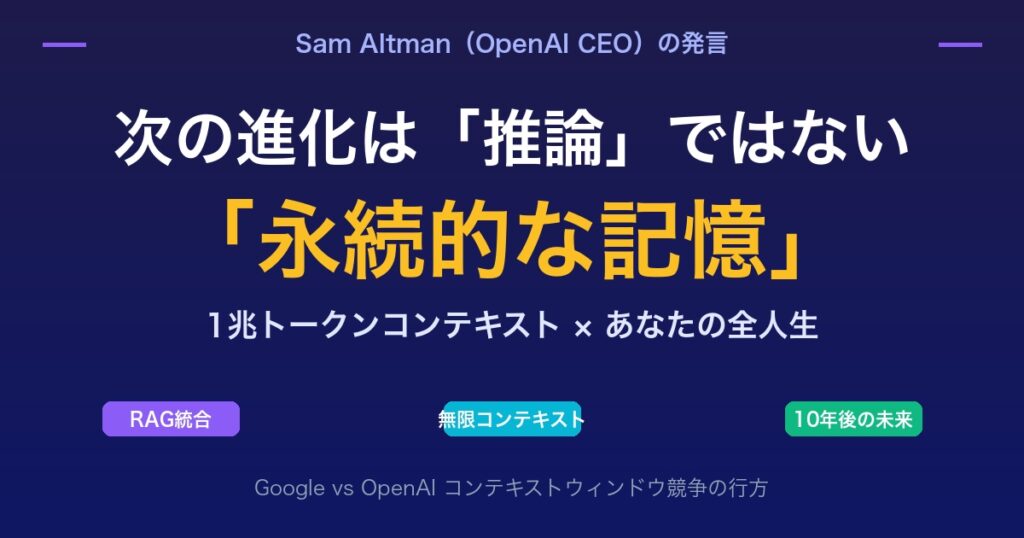 「推論能力の向上」ではなく「永続的な記憶」 「AIの本当のブレークスルーは推論能力の向上ではなく、完全で永続的な記憶だ」 OpenAI CEO サム・アルトマン氏がSequoia主催のAIイベントで語ったこの言葉が、AI業界に大きな反響を呼んでいます。o3やGemini ... -