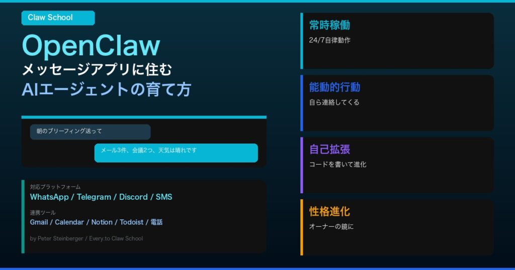 メッセージアプリに「住む」AIエージェント──OpenClawとは AIメディアEvery.toが、OpenClawの包括的な入門ガイド「Claw School」を公開した。OpenClawとは、Peter Steinberger氏が開発したオープンソースのパーソナルAIエージェントフレームワークだ。 Cha... -