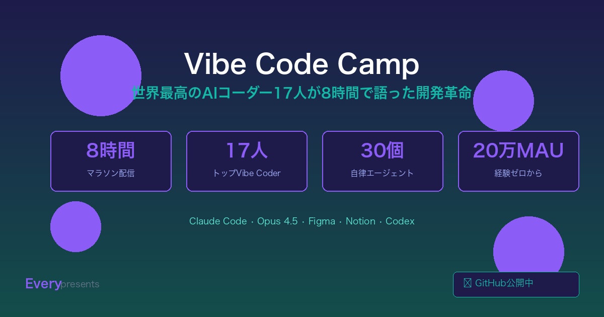 Everyが開催した8時間マラソンライブストリーム「Vibe Code Camp」が、AI開発コミュニティで大きな話題を呼んでいる。